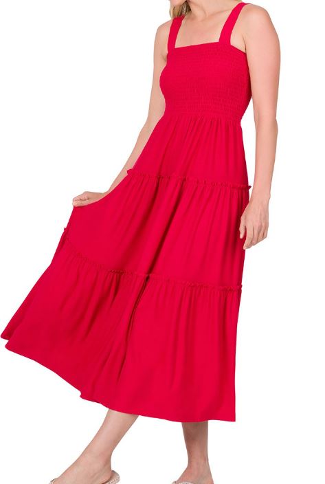 Feminine and flattering, this Smocked Tiered Midi Dress features a square neckline, wide straps, and a smocked bodice. Soft, stretchy, and true to size for all-day comfort.
